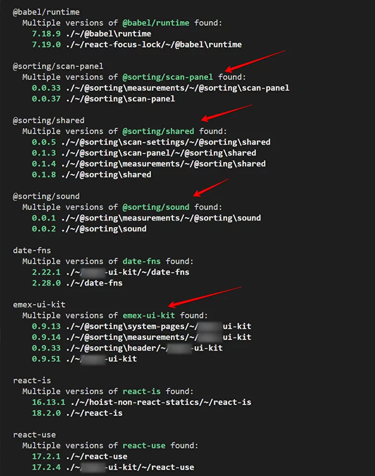 We use a plugin that analyses the project and displays a list of duplicate packages with different versions. Here is an example of the results of its work, using a sorting project as an example: