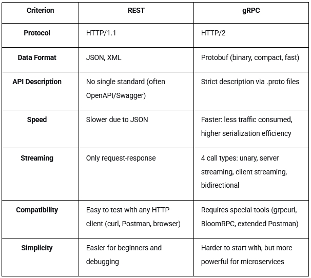 REST API has long been the standard, but it has its limitations. When load increases, streaming scenarios appear, or business requires faster communication between services, REST stops being the ultimate solution. gRPC solves what REST cannot: it provides high data transfer speeds, supports streaming, and enforces a strict interaction structure. It is convenient to use in microservices, mobile, and IoT applications.