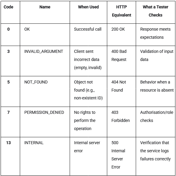 In gRPC, every response (even a successful one) is accompanied by a status code. These are not HTTP 200/404/500, but their own set of codes defined in the gRPC library. In total, gRPC has 17 predefined status codes, from 0 to 16, but we will consider only the most basic and commonly used ones.